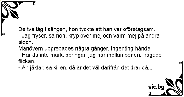 - Jag fryser, sa hon, kryp över mej och värm mej på andra sidan.