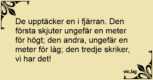De upptäcker en i fjärran. Den första skjuter ungefär en meter för högt; den andra, ungefär en meter för låg; den tredje skriker, vi har det!