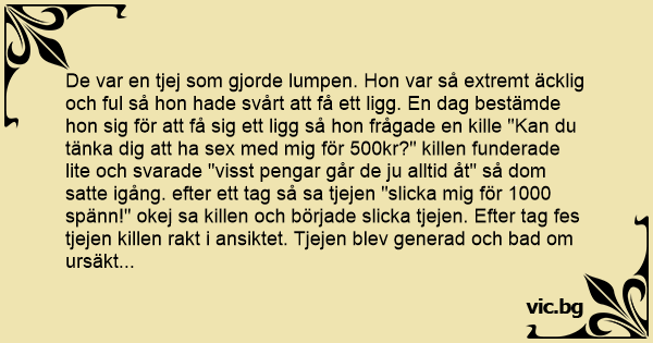 De var en tjej som gjorde lumpen. Hon var så extremt äcklig och ful så hon hade svårt att få ett ligg. En dag bestämde hon sig för att få sig ett ligg så hon frågade en kille "Kan du tänka dig att ha sеx med mig för 500kr?" killen funderade lite och svarade "visst pengar går de ju alltid åt" så dom satte igång. efter ett tag så sa tjejen "slicka mig för 1000 spänn!" okej sa killen och började slicka tjejen. Efter tag fes tjejen killen rakt i ansiktet. Tjejen blev generad och bad om ursäkt flera gånger. Killen sa glatt "Men snälla du de gör inget, de var skönt med lite frisk luft!"