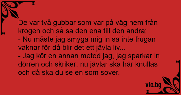 - Jag kör en annan metod jag, jag sparkar in dörren och skriker: nu jävlаr ska här knullas och då ska du se en som sover.