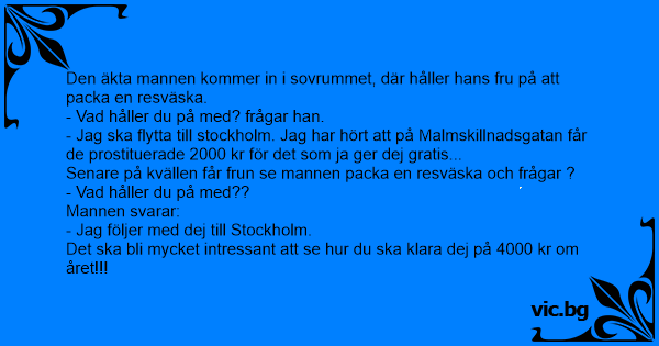 - Jag ska flytta till stockholm. Jag har hört att på Malmskillnadsgatan får de prostituerade 2000 kr för det som ja ger dej gratis...