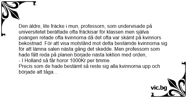 Den äldre, lite fräcke i mun, professorn, som undervisade på universitetet berättade ofta fräckisar för klassen men själva poängen retade ofta kvinnorna då det ofta var skämt på kvinnors bekostnad. För att visa motstånd mot detta bestämde kvinnorna sig för att lämna salen nästa gång det skedde. Men professorn som hade fått reda på planen började nästa lektion med orden, - I Holland så får horor 1000Kr per timme. Precis som de hade bestämt så reste sig alla kvinnorna upp och började att tåga mot dörren. Professorn ropade högt, - Men var är ni på väg? Flyget till Holland går ju inte förrens om tre timmar!