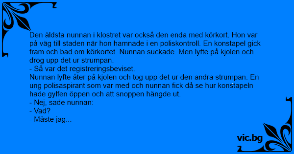 Den äldsta nunnan i klostret var också den enda med körkort. Hon var på väg till staden när hon hamnade i en poliskontroll. En konstapel gick fram och bad om körkortet. Nunnan suckade. Men lyfte på kjolen och drog upp det ur strumpan.