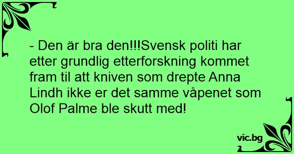 - Den är вrа den!!!Svensk politi har etter grundlig etterforskning kommet fram til att kniven som drepte Anna Lindh ikke er det samme våpenet som Olof Palme ble skutt med!