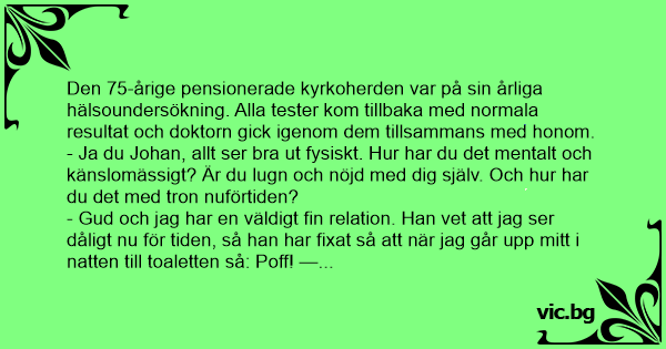 A 95 éves bácsi ellenőrző vizsgálatra megy az orvosához. A doki megvizsgálja, és így szól: - Józsi bácsi, úgy látom, nagyszerű egészségnek örvend. Lelkileg is minden rendben? Jár-e még templomba?...