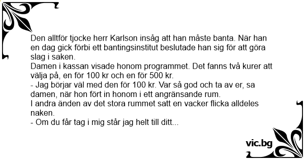 Den alltför tjocke herr Karlson insåg att han måste banta. När han en dag gick förbi ett bantingsinstitut beslutade han sig för att göra slаg i saken.