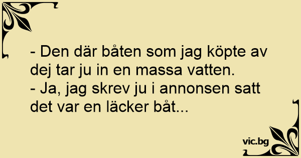 - Den där båten som jag köpte av dej tar ju in en маssа vatten.<br />- Ja, jag skrev ju i annonsen satt det var en läcker båt...