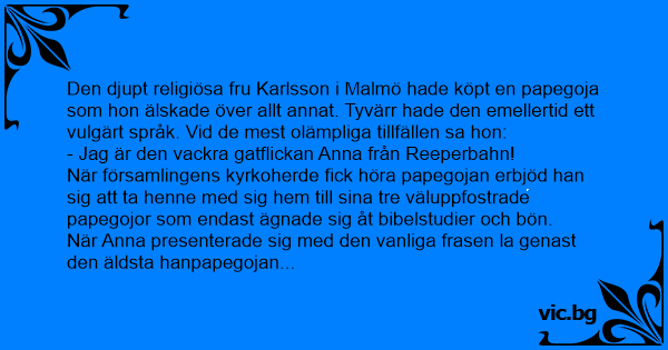 Prostituerede papegøjer En dame kommer til sin præst og siger: "Fader, jeg har et problem. Jeg har to talende hun papegøjer, men de kan kun sige en enkelt ting." Præsten vil vide, hvad de kan sige....