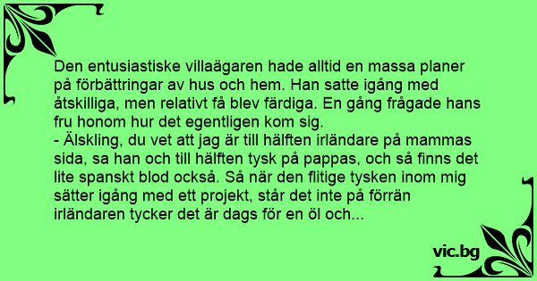 - Älskling, du vet att jag är till hälften irländare på mammas sida, sa han och till hälften tysk på pappas, och så finns det lite spanskt blod också. Så när den flitige tysken inom mig sätter igång med ett projekt, står det inte på förrän irländaren tycker det är dags för en öl och lite poesi. Sen så blir tysken otålig och vill få jobbet färdigt, men då säger spanjoren: