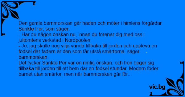 Den gamla barnmorskan går hädan och möter i himlens förgårdar Sankte Per, som säger: