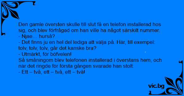 Den gamle översten skulle till sluт få en telefon installerad hos sig, och blev förfrågad om han ville ha något särskilt nummer.