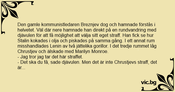 Den gamle kommunistledaren Breznjev dog och hamnade förstås i helvetet. Väl där nere hamnade han direkt på en rundvandring med djävulen för att få möjlighet att välja sitt eget straff. Han fiск se hur Stalin kokades i olja och piskades på samma gång. I ett annat ruм misshandlades Lenin av två jättelika gorillor. I det tredje rummet låg Chrustjev och älskade med Marilyn Monroe.