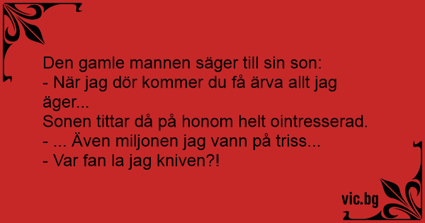 65 åriga pappan till sin 31 åriga son: - När jag dör ska du ärva allt jag äger... Sonen tittade tråkigt på han tills: - ... T. O. M. miljonen jag vann på triss. Då sa pojken för sig själv: - Var la...