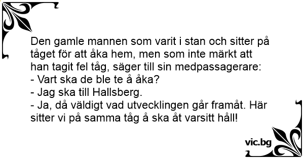 Den gamle mannen som varit i stan och sitter på tåget för att åka hem, men som inte märkt att han tagit fel tåg, säger till sin medpassagerare:
