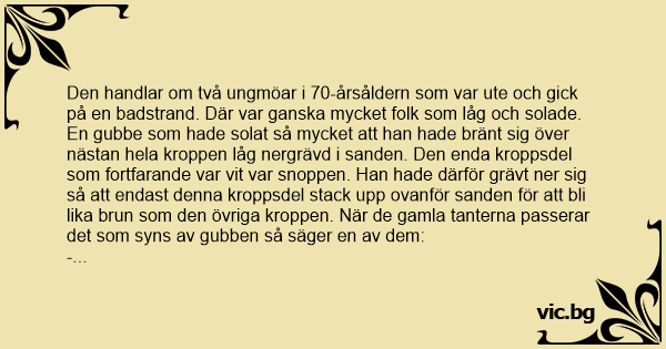 Den handlar om två ungmöar i 70-årsåldern som var ute och gick på en badstrand. Där var ganska mycket folk som låg och solade. En gubbe som hade solat så mycket att han hade bränt sig över nästan hela kroppen låg nergrävd i sanden. Den enda kroppsdel som fortfarande var vit var snoppen. Han hade därför grävt ner sig så att endast denna kroppsdel stack upp ovanför sanden för att bli lika brun som den övriga kroppen. När de gamla tanterna passerar det som syns av gubben så säger en av dem: