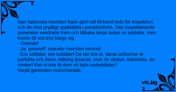 Den italienska översten hade gjort sitt förband redo för inspektion, och de stod prydligt uppklädda i paraduniform. Den inspekterande generalen vandrade fram och tillbaka längs leden av soldater, men kunde till sist inte bärga sig.