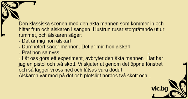 Den klassiska scenen med den äkta mannen som kommer in och hittar frun och älskaren i sängen. Hustrun rusar storgråtande ut ur rummet, och älskaren säger: