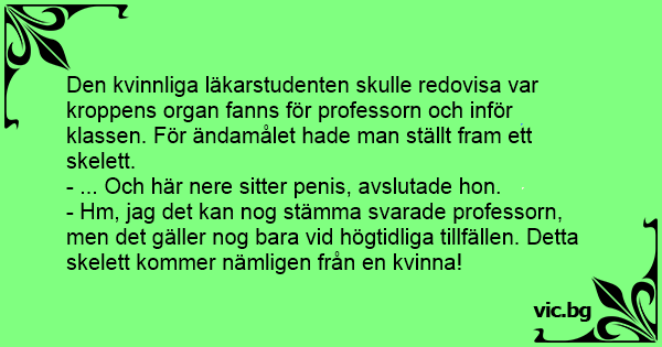 В час по анатомия, професор показва човешки скелет и пита: - Кой може да ми каже, дали скелета е на жена или мъж? Една студентка вдига ръка и казва: - На мъж е! Професорът я помолил да се...