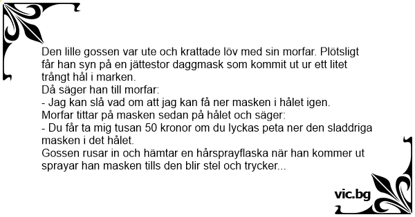 Gossen rusar in och hämtar en hårsprayflaska när han kommer ut sprayar han masken tills den blir stel och trycker ner masken i hålet. Morfar Ger honom 50 kronor och tar hår sprayen och går in. Efter en halv timme kommer morfar ut igen och ger gossen en 50 lapp.
