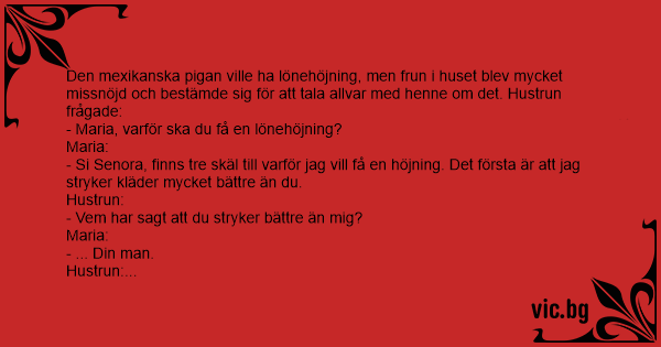- Si Senora, finns tre skäl till varför jag vill få en höjning. Det första är att jag stryker kläder mycket bättre än du.