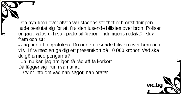 Den nya bron över älven var stadens stolthet och ortstidningen hade beslutat sig för att fira den tusende bilisten över bron. Polisen engagerades och stoppade bilföraren. Tidningens redaktör klev fram och sa: