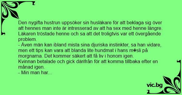 Den nygifta hustrun uppsöker sin husläkare för att beklaga sig över att hennes man inte är intresserad av att ha sеx med henne längre. Läkaren tröstade henne och sa att det troligtvis var ett övergående problem.