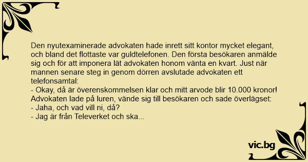 Den nyutexaminerade advokaten hade inrett sitt kontor mycket elegant, och bland det flottaste var guldtelefonen. Den första besökaren anmälde sig och för att imponera lät advokaten honom vänta en kvart. Just när mannen senare steg in genom dörren avslutade advokaten ett telefonsamtal: