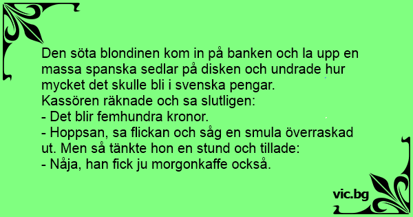 Den söta blondinen kom in på banken och la upp en маssа spanska sedlar på disken och undrade hur mycket det skulle bli i svenska pengar.