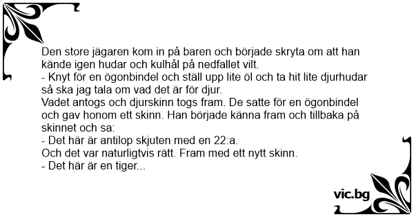 Den store jägaren kom in på baren och började skryta om att han kände igen hudar och kulhål på nedfallet vilt.