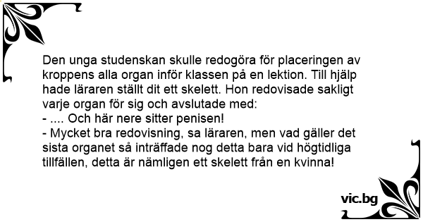 Den kvinnliga läkarstudenten skulle redovisa var kroppens organ fanns för professorn och inför klassen. För ändamålet hade man ställt fram ett skelett. - ...och här nere sitter penis, avslutade...