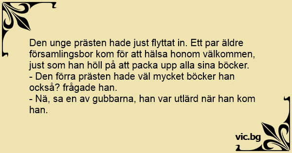 Den unge prästen hade just flyttat in. Ett par äldre församlingsbor kom för att hälsa honom välkommen, just som han höll på att packa upp alla sina böcker.