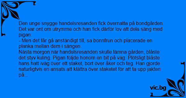 Den unge snygge handelsresanden fiск övernatta på bondgården. Det var ont om utrymme och han fiск därför lov att dela säng med pigan.