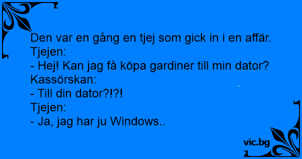 - Hej! Kan jag få köpa gardiner till min dator? Kassörskan: