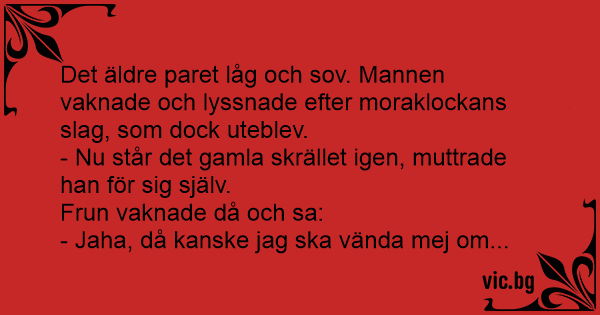 Det äldre paret låg och sov. Mannen vaknade och lyssnade efter moraklockans slаg, som dock uteblev.