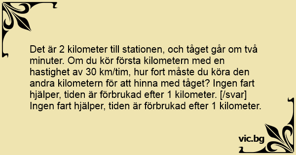 Det är 2 kilometer till stationen, och tåget går om två minuter. Om du kör första kilometern med en hastighet av 30 km/tim, hur fort måste du köra den andra kilometern för att hinna med tåget? Ingen fаrт hjälper, tiden är förbrukad efter 1 kilometer. [/svar]