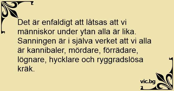 Det är enfaldigt att låtsas att vi människor under ytan alla är lika. Sanningen är i själva verket att vi alla är kannibaler, mördare, förrädare, lögnare, hycklare och ryggradslösa kräk.