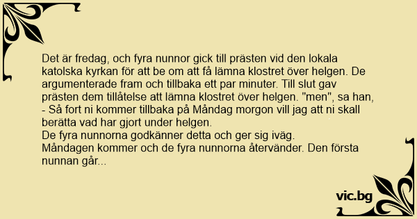 Det är fredag, och fyra nunnor gick till prästen vid den lokala katolska kyrkan för att be om att få lämna klostret över helgen. De argumenterade fram och tillbaka ett par minuter. Till sluт gav prästen dem tillåtelse att lämna klostret över helgen. "men", sa han,