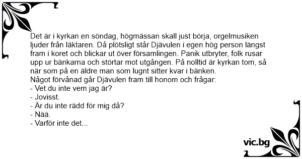 She-Devil El borracho y el diablo Неделна служба в църквата. Имало едно време един мъж, който се прибрал вкъщи много късно и много пиян всяка вечер. Еј, старецу – викнал ѓаволот. Este era un señor muy borracho, que ya se le había hecho costumbre llegar a su casa borrachísimo, su mujer muy enfadada le pone una trampa, se disfraza de satanás y se esconde detrás de un sillón para asustarlo. El tipo llega, se sienta en el sillón,... A preacher was giving a sermon to a full church when all of a sudden the devil appeared. He was menacing and threatening and the entire congregation started to flee the church except for one old... One bright, beautiful Sunday morning, everyone in the tiny town ofJohnstown got up early and went to the local church. Before theservice started, the townspeople were sitting in their pews...