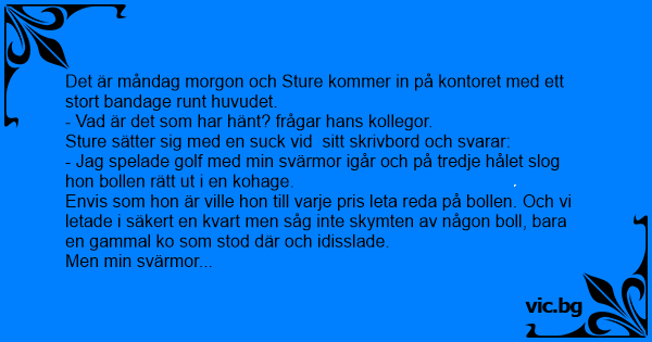 - Jag spelade golf med min svärmor igår och på tredje hålet slog hon bollen rätt ut i en kohage.