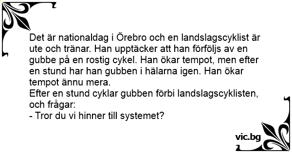 Efter en stund cyklar gubben förbi landslagscyklisten, och frågar: