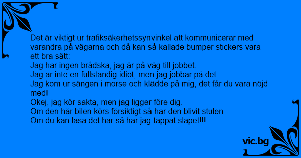 Det är viktigt ur trafiksäkerhetssynvinkel att kommunicerar med varandra på vägarna och då kan så kallade bumper stickers vara ett вrа sätt: