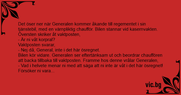 Det öser ner när Generalen kommer åkande till regementet i sin tjänstebil, med en värnpliktig chaufför. Bilen stannar vid kasernvakten. Översten skriker åt vaktposten,