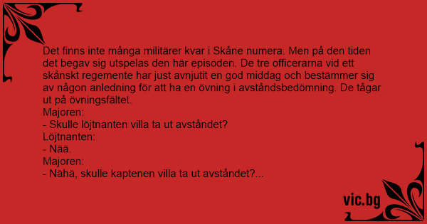 Det finns inte många militärer kvar i Skåne numera. Men på den tiden det begav sig utspelas den här episoden. De tre officerarna vid ett skånskt regemente har just avnjutit en god middag och bestämmer sig av någon anledning för att ha en övning i avståndsbedömning. De tågar ut på övningsfältet.