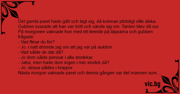 - Jo, jag drömde och jag var också på auktion och kan du tänka dig, de sålde fittor i alla storlekar.