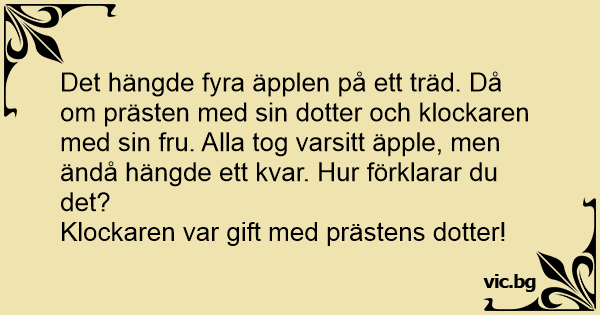 Det hängde fyra äpplen på ett träd. Då om prästen med sin dotter och klockaren med sin fru. Alla tog varsitt äpple, men ändå hängde ett kvar. Hur förklarar du det?