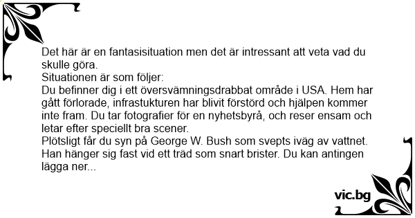 Plötsligt får du syn på George W. Bush som svepts iväg av vattnet. Han hänger sig fast vid ett träd som snart brister. Du kan antingen lägga ner kameran och rädda honom eller ta ett Pulitzer-vinnande foto på honom då han försvinner i djupet.
