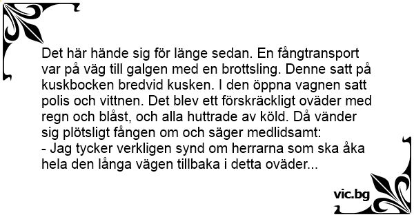 Det här hände sig för länge sedan. En fångtransport var på väg till galgen med en brottsling. Denne satt på kuskbocken bredvid kusken. I den öppna vagnen satt polis och vittnen. Det blev ett förskräckligt oväder med regn och blåst, och alla huttrade av köld. Då vänder sig plötsligt fången om och säger medlidsamt: