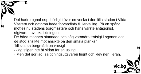 Det hade regnat oupphörligt i över en vecka i den lilla staden i Vilda Västern och gatorna hade förvandlats till lervälling. På en spång möttes nu stadens borgmästare och hans värste antagonist, utgivaren av lokaltidningen.