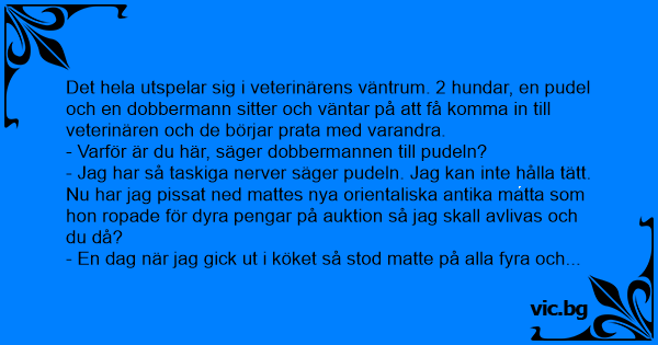 Tre hundar sitter i väntrummet hos veterinären. Det är alldeles tyst då en av hundarna försöker lätta upp stämningen genom att fråga en annan hund: - Varför är du här? Den andra hunden svarar...