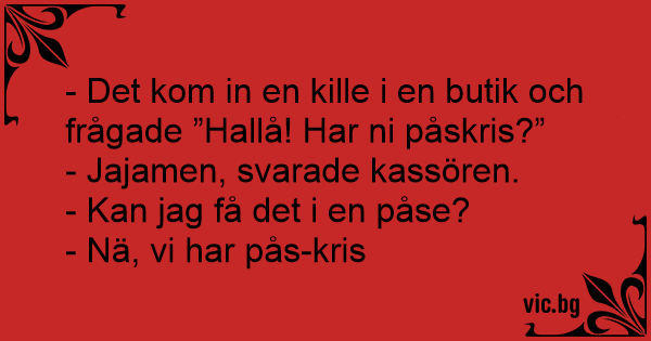 - Det kom in en kille i en butik och frågade ”Hallå! Har ni påskris?”